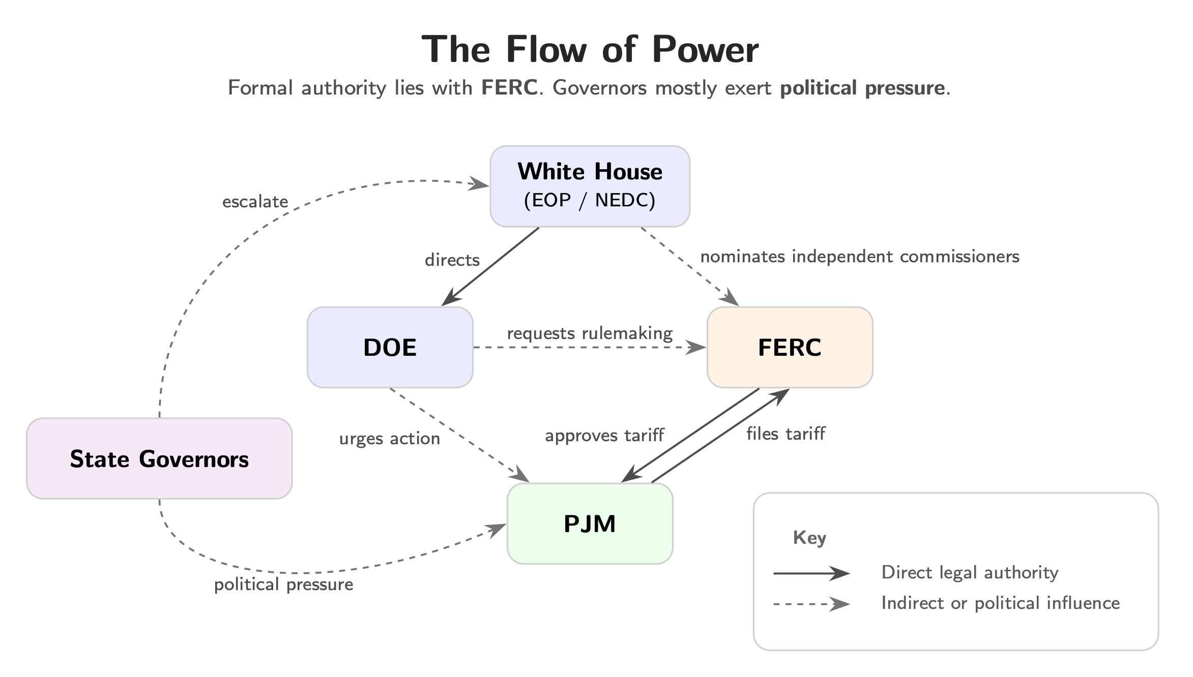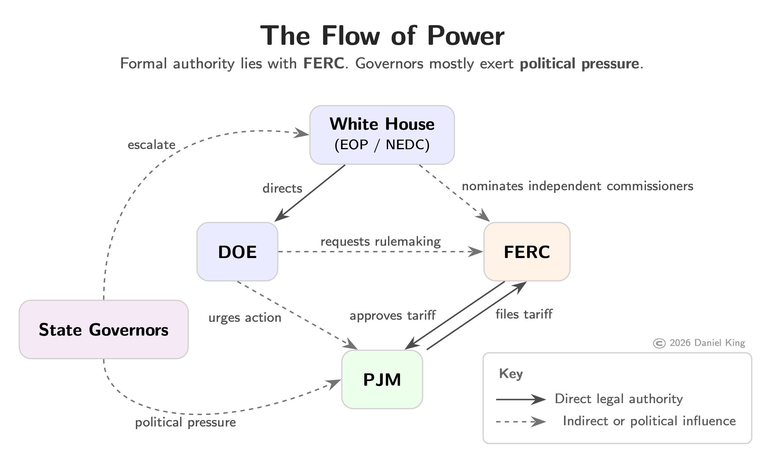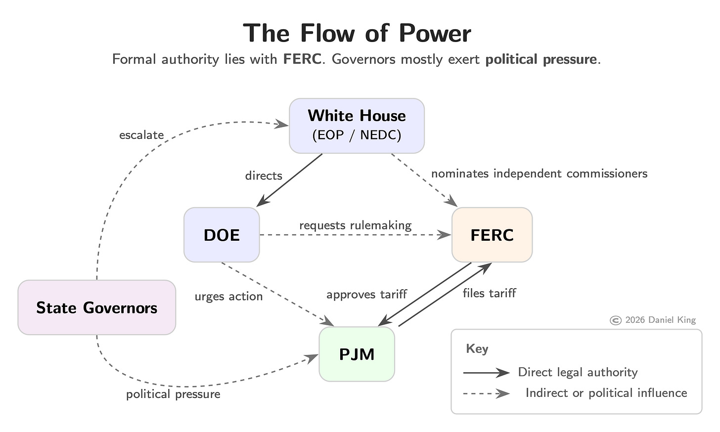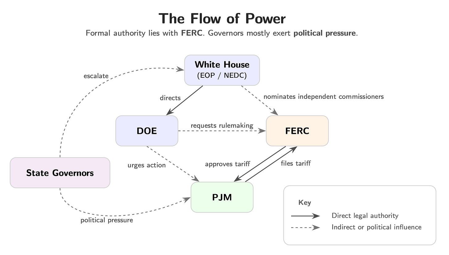 Why did these governors—including prominent Democrats who have made hay out of pushing back against the Trump administration—go to the White House? Because governors can’t order PJM to change its market rules, since PJM’s tariff lives under federal jurisdiction. All action must run through FERC. For instance, PJM must first make a filing at FERC, or FERC itself must launch a proceeding. A White House intervention is a top-down way to force action.