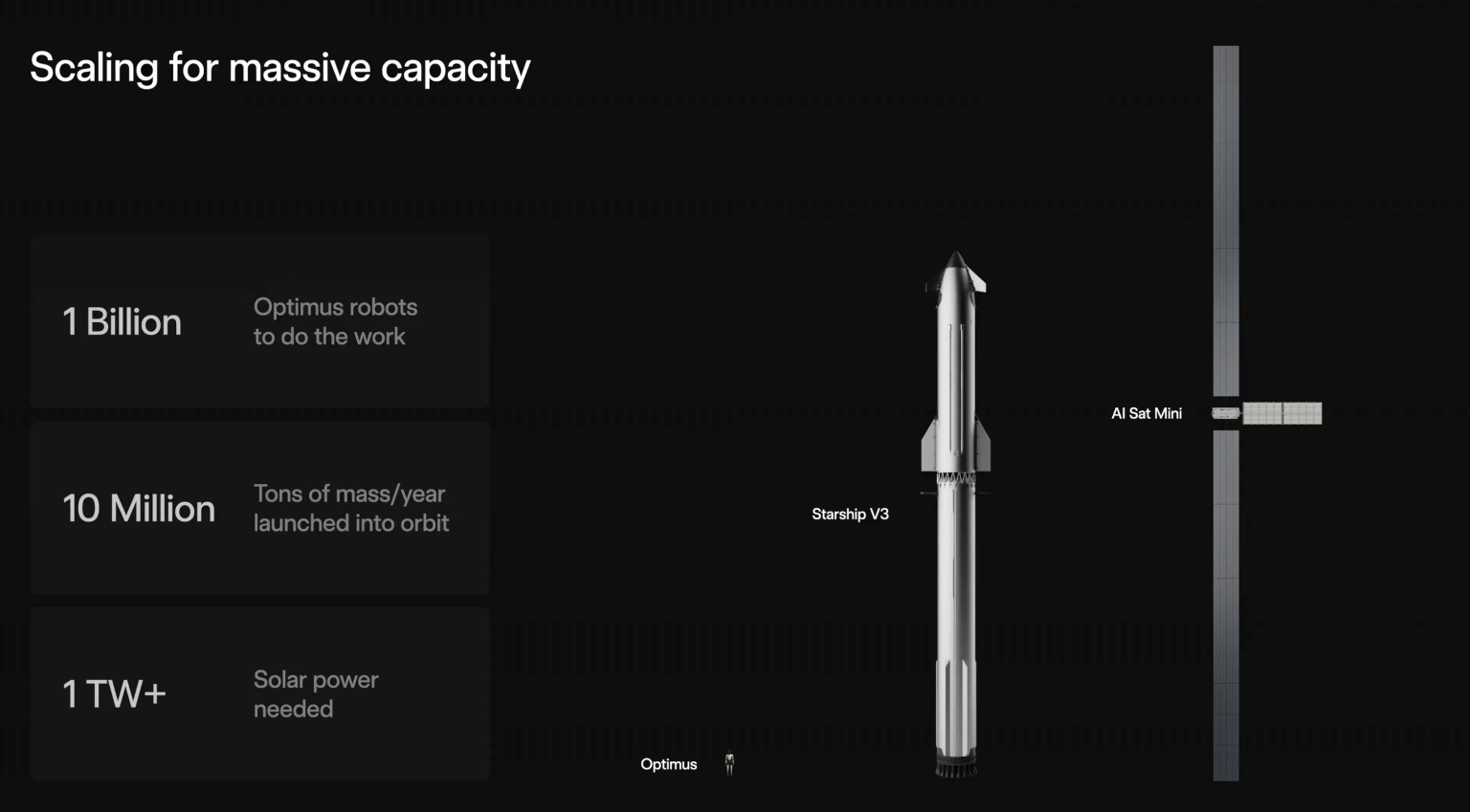Much ink has already been spilled on why this is, to put it mildly, premature. The economics are punishing: although solar energy is more plentiful in space, orbital data centers are projected to cost roughly three times their terrestrial equivalents unless launch prices fall by an order of magnitude, and hardware would degrade rapidly in the unforgiving environment. The filing is silent on these questions, containing no technical specifications, no deployment schedule, and no cost estimates. But Musk has since offered a rough first sketch: a “mini” orbital compute satellite with exceptionally long solar arrays, paired with a comically small radiator, often the limiting component to prevent chips from overheating. Suffice it to say, the presentation did little to resolve the core economic and engineering doubts.
